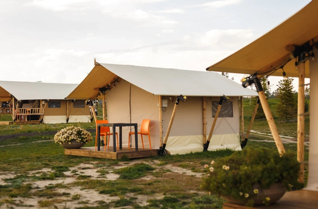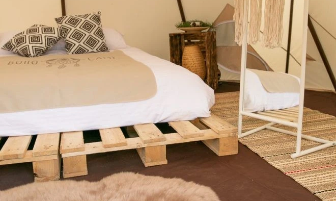 Обладнане місце для намета. З підлогою із сосни та тентовим дахом.